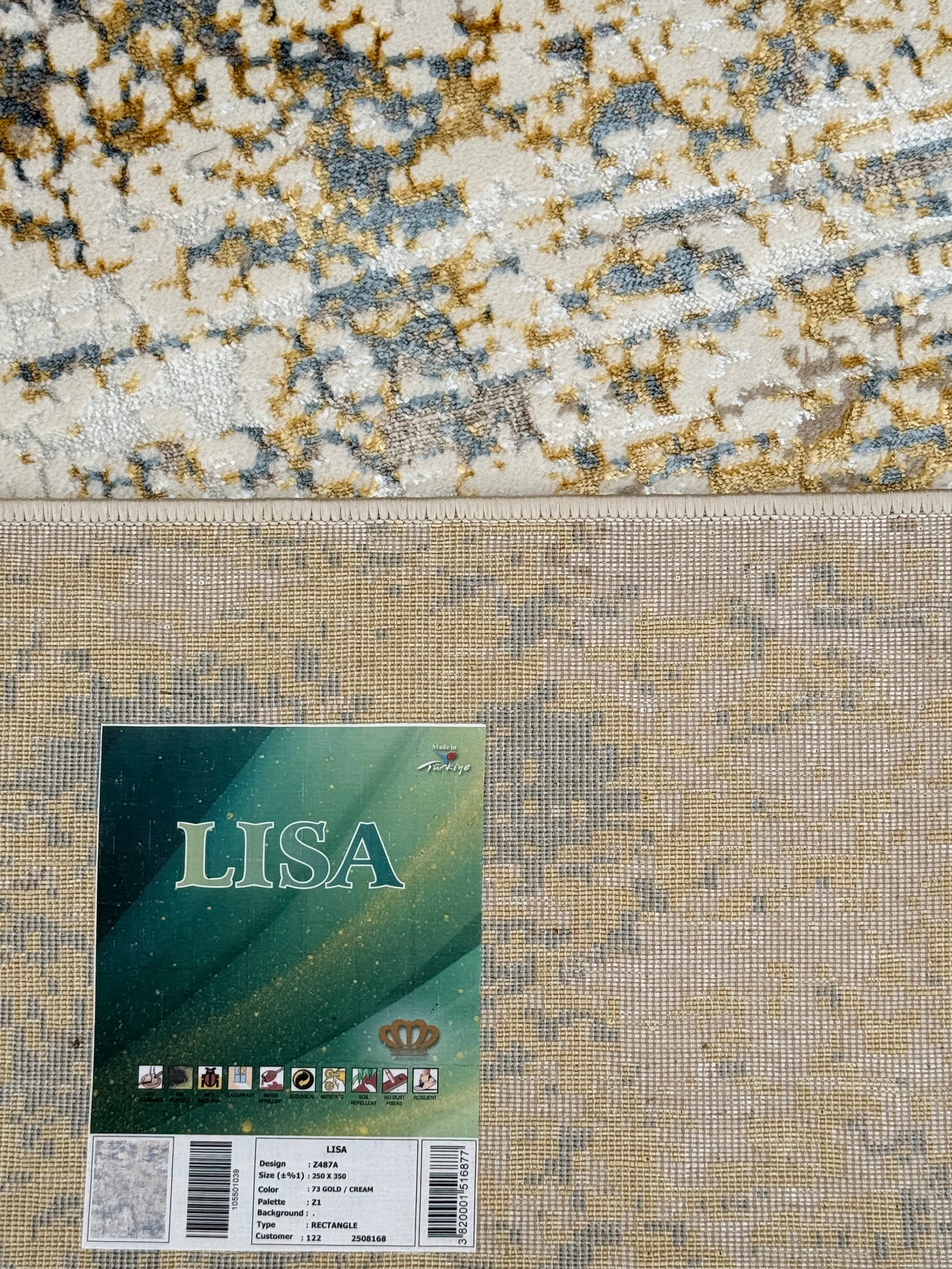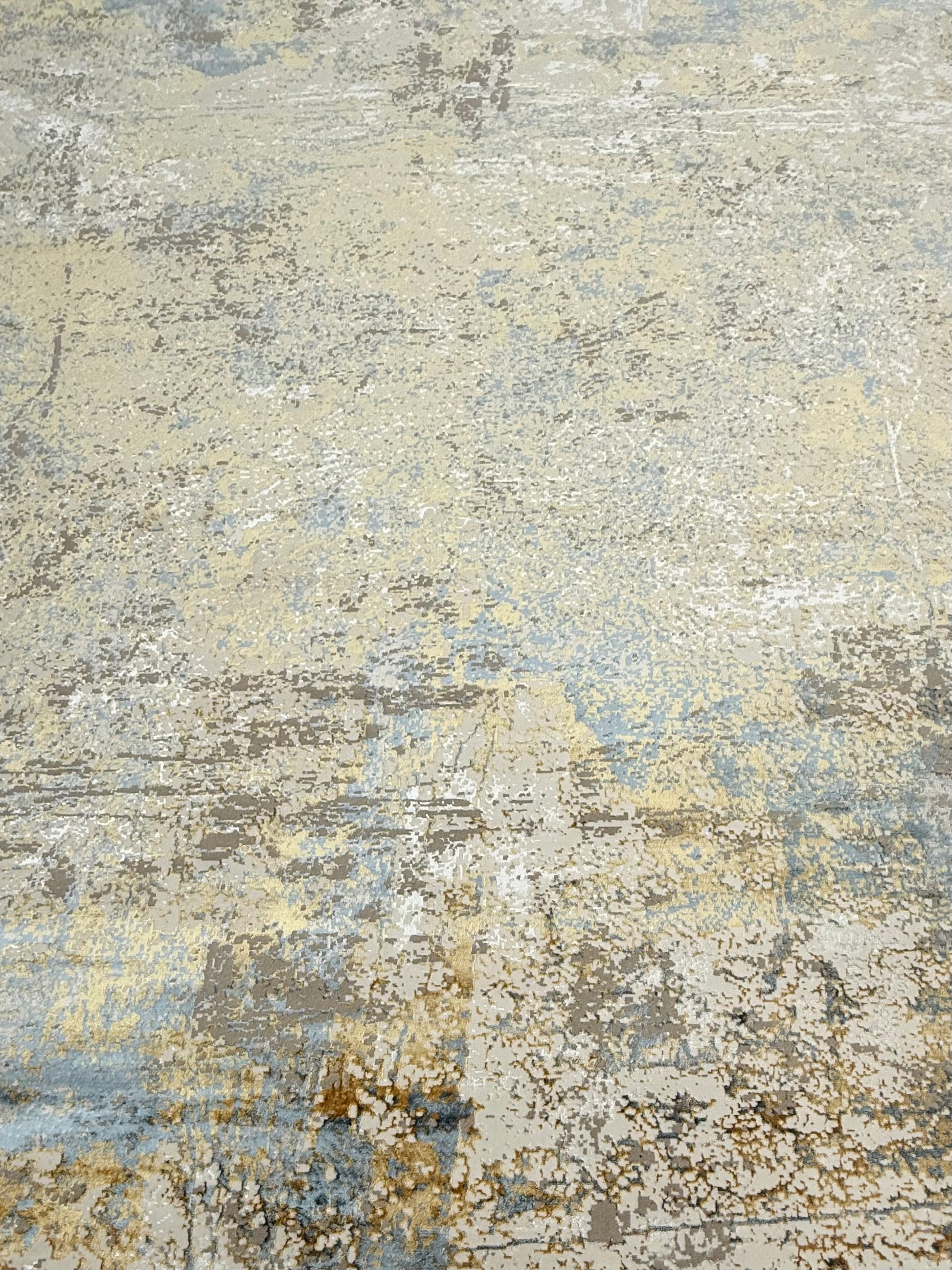Bring contemporary elegance to your space with this Abstract Textured Modern Rug, designed with a soothing blend of beige, cream, grey, gold, and light blue tones. Its distressed abstract pattern adds depth and character, making it perfect for modern, minimalist, and luxury interiors.
