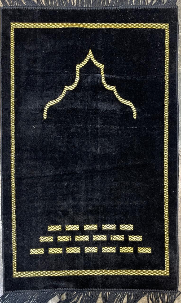 Introducing the Midnight Gleam Prayer Mat, sized at 2.5x4.25, featuring a predominantly deep black color with subtle golden accents. This prayer mat combines the elegance of dark hues with just a hint of gold, creating a refined and understated touch of luxury. The plush texture provides exceptional comfort during prayer, while the delicate golden highlights add a sophisticated flair without overwhelming the serene black base. The Midnight Gleam Prayer Mat is perfect for adding a touch of elegance to your spiritual space while maintaining a tranquil and contemplative atmosphere.