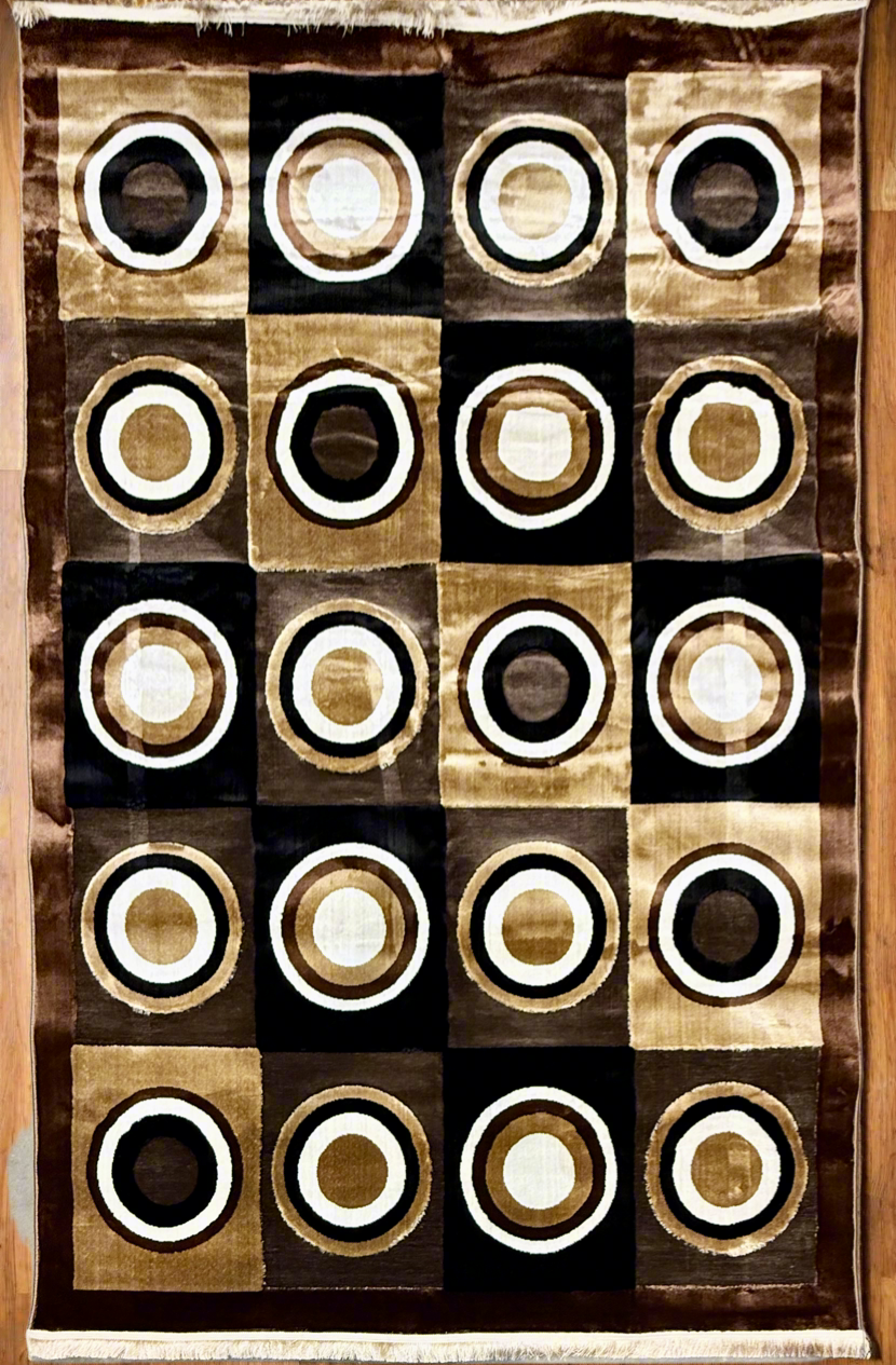 Modern Geometric Circle Pattern Rug – Brown and Beige with Fringe Trim