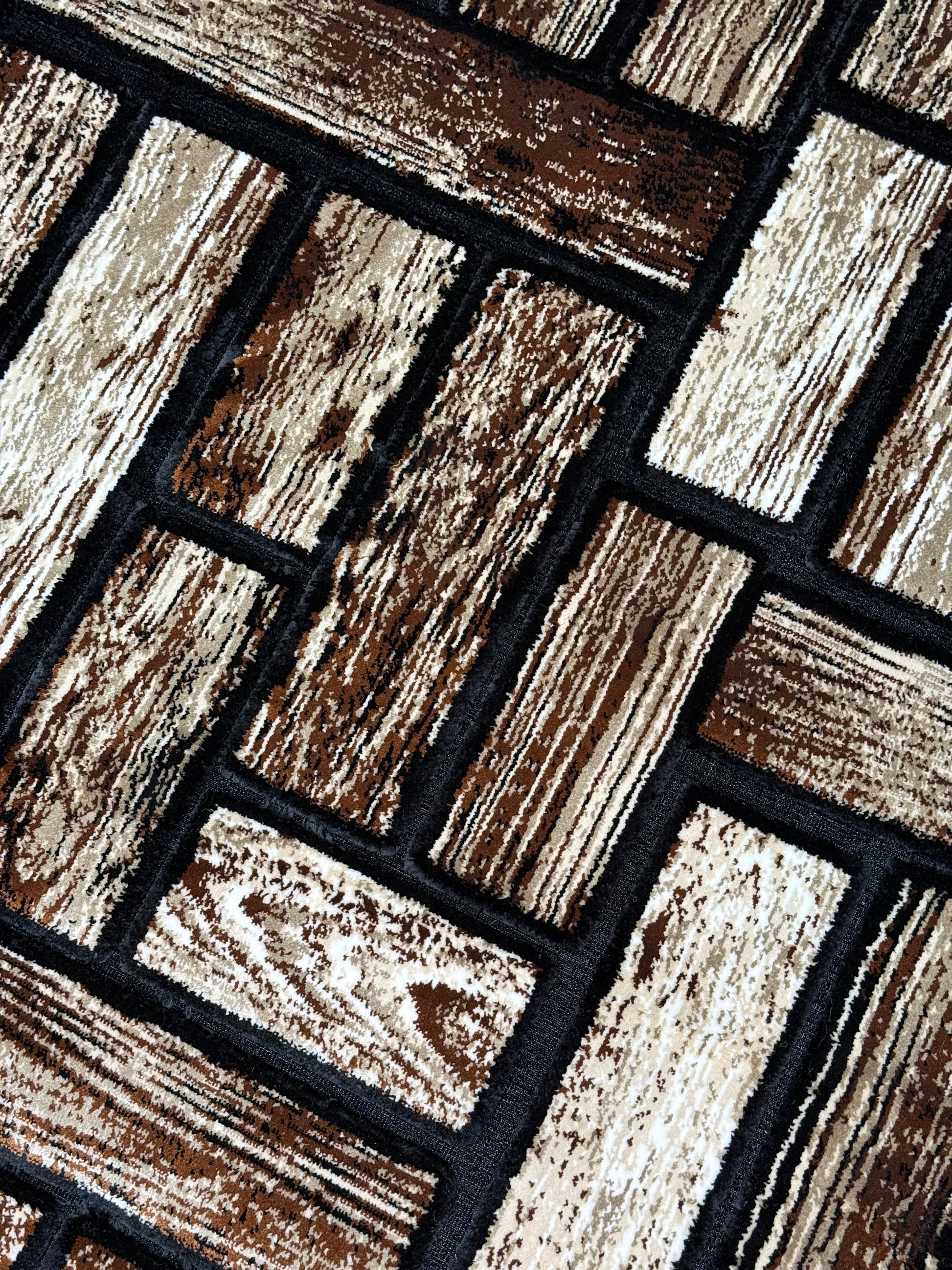 Embrace the rugged beauty of nature with this striking rustic wood plank pattern rug. This design masterfully recreates the look of weathered wooden planks, featuring a rich and varied palette of earthy tones. Deep black outlines and backgrounds accentuate the individual "planks," which showcase a range of warm brown shades, from light oak to deep mahogany. Interspersed throughout are touches of soft cream, providing a gentle contrast and highlighting the texture of the wood grain.