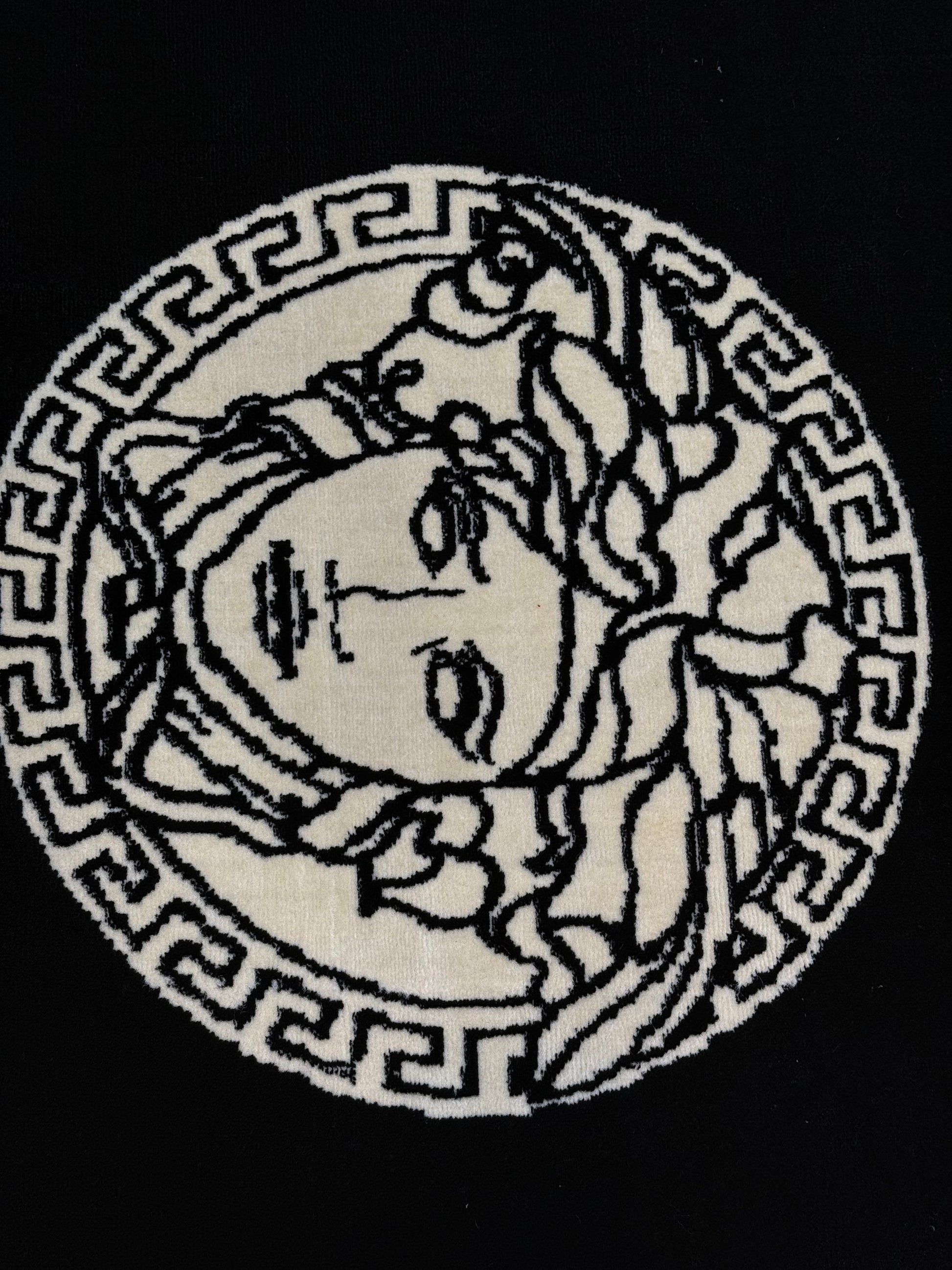 Enhance your space with this luxurious black Versace-inspired area rug, designed to bring sophistication and elegance to any room. Measuring 5x8 feet, this rug features an opulent design with intricate patterns reminiscent of high-end Italian fashion.